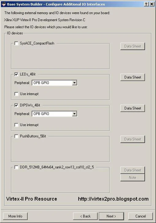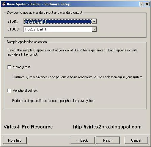 RS232_Uart_1 for both STDIN and STDOUT. The Base System Builder can produce sample software applications to run on the PowerPC and test the memory and peripherals. For this project we will not need them as we will create our own. Un-tick “Memory Test” and “Peripheral Test”. Click “Next”.