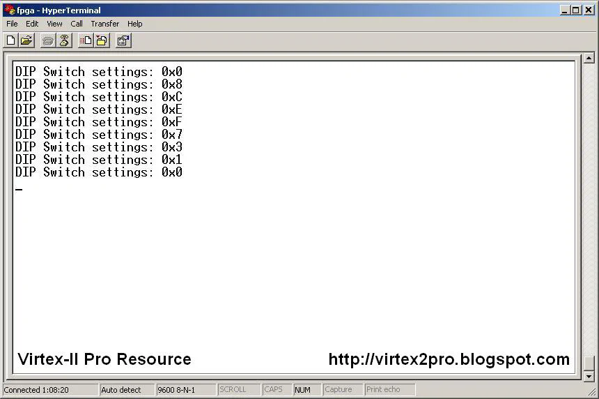 After a few changes in the DIP switches, the Hyperterminal output should look similar to the screen shot below: