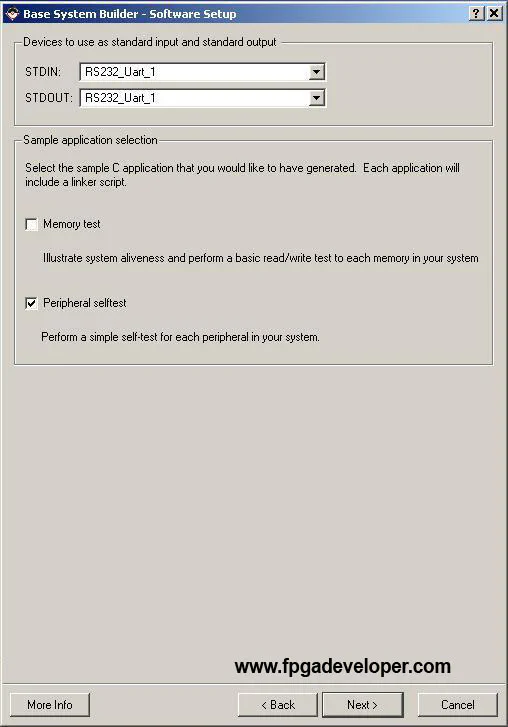 RS232_Uart_1 for both STDIN and STDOUT. Un-tick “Memory Test” and leave “Peripheral Test” ticked. Click “Next”.