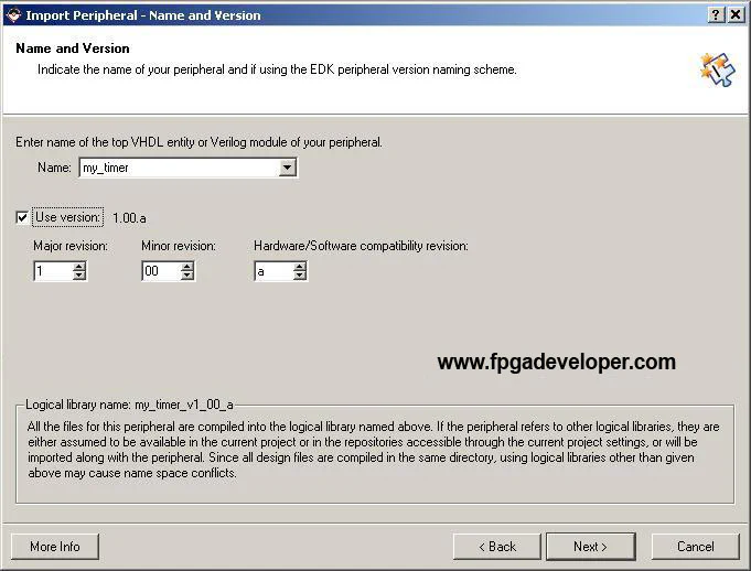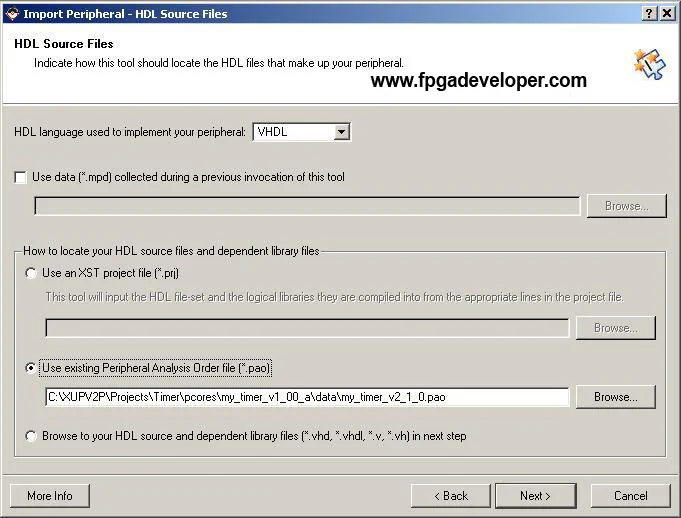 pcores\my_timer_v1_00_a\data and select the my_timer_v2_1_0.pao file. Click “Next”.