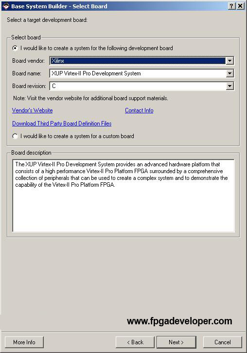 - Select “Xilinx” as the board vendor. Select “XUP Virtex II Pro Development System” as the board name. Select “C” as the board revision. Click “Next”.