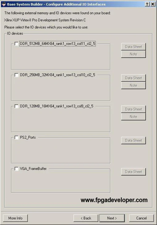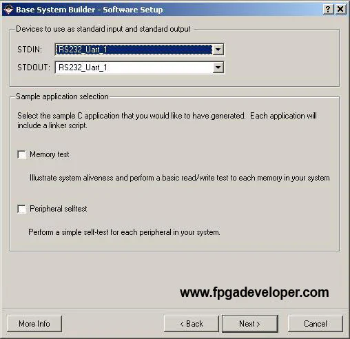 RS232_Uart_1 for both STDIN and STDOUT. The Base System Builder can produce sample software applications to run on the PowerPC and test the memory and peripherals. For this project we will not need them as we will create our own. Un-tick “Memory Test” and “Peripheral Test”. Click “Next”.