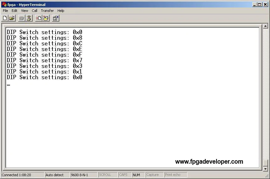The simple C program that we added to this project simply reads the DIP switch settings and sends a message with that data to the UART. It also writes the same values to the LEDs. When the application is running and Hyperterminal is open, the DIP switch settings should be seen on the LEDs and on the Hyperterminal screen. Change the DIP switches to see the message change.