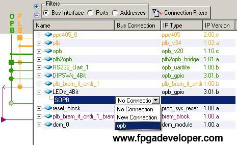 opb_gpio_0. Click on the instance and rename it to LEDs_4Bit. XPS automatically modifies the system.mss and system.mhs files to include the new IP details.LEDs_4Bit tree and selecting “opb” for the “SOPB” bus connection.