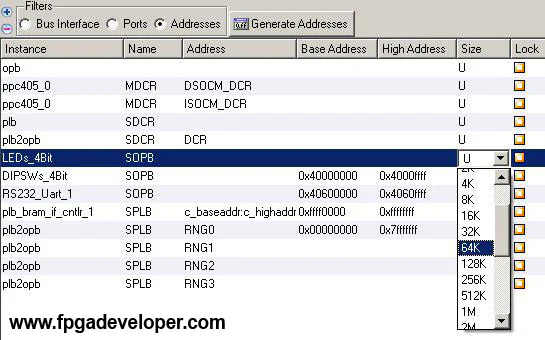 system.mhs file to include the new external port.LEDs_4Bit size drop-down menu and select 64K. Then click “Generate Addresses”. XPS automatically reconfigures the memory map and gives the LEDs GPIO a base address and a high address. It also automatically modifies the system.mhs file to update the IP address details.