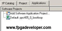 Default: ppc405_0_bootloop. The purpose of this application is to occupy the PowerPC in the case that there is no other software application in the design. It simply keeps the PowerPC running in an endless loop.