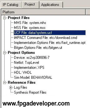 The remaining details to include in the hardware description are the external pin connections of the LEDs. This is specified in the system.ucf file which is up to the user to modify according to the external hardware configuration (ie. How the FPGA pins are wired up on the XUPV2P board). Follow these steps to modify the constraints file: