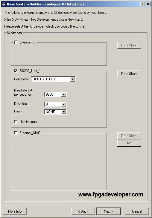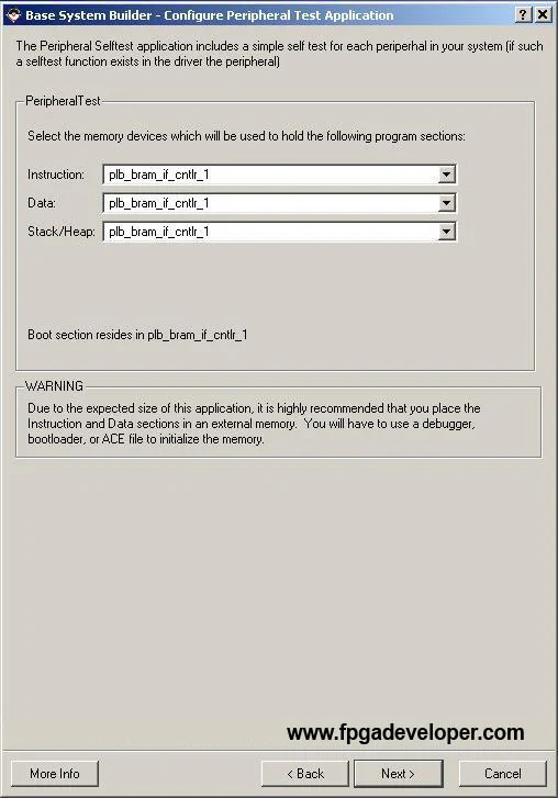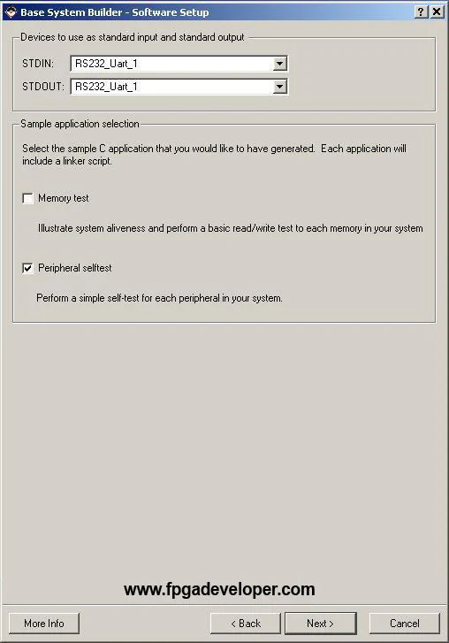RS232_Uart_1 for both STDIN and STDOUT. Un-tick “Memory Test” and leave “Peripheral Test” ticked. Click “Next”.