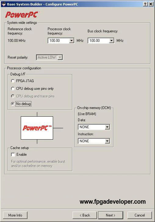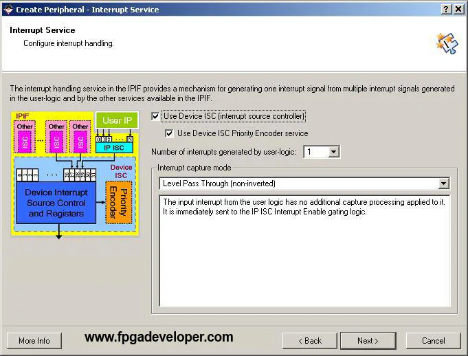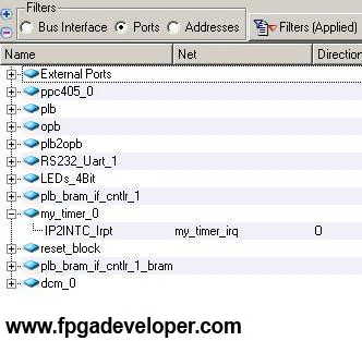 The PowerPC has only one input for non-critical interrupt requests and in this project, we used it for our Timer peripheral. In a more complex design with multiple interrupts sources, we need to use an interrupt controller to multiplex all the interrupt request signals into one. This is the topic of the next tutorial.