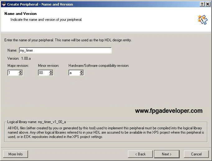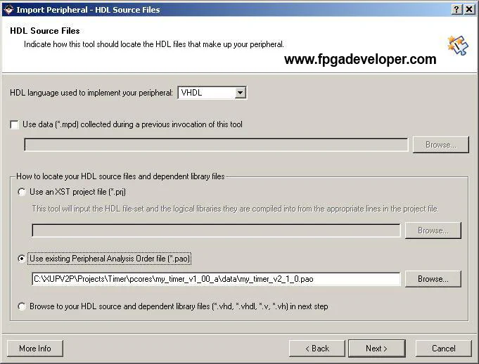 pcores\my_timer_v1_00_a\data and select the my_timer_v2_1_0.pao file. Click “Next”.