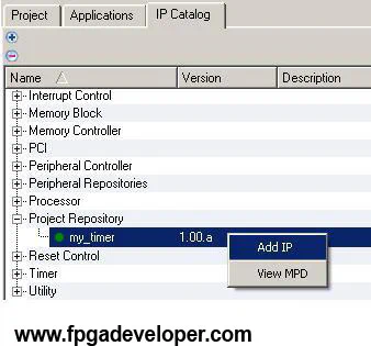 my_timer IP core in the “Project Repository” group. Right click on the core and select “Add IP”.