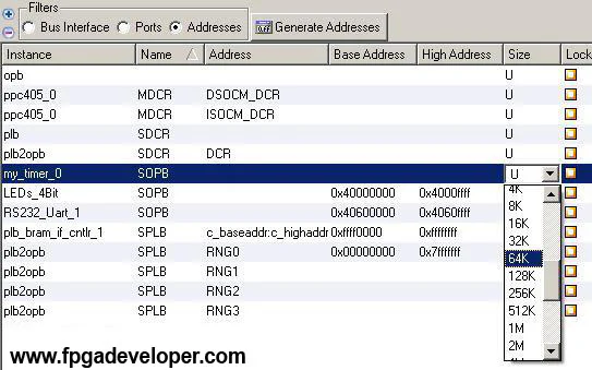 ppc405_0 to view the PowerPC ports. Click on the “Net” field for the “EICC405EXTINPUTIRQ” port. Type my_timer_irq in this field and press “Enter”. This connects the timer interrupt request signal to the interrupt request input of the PowerPC.my_timer_0 to 64K. Then click “Generate Addresses”.
