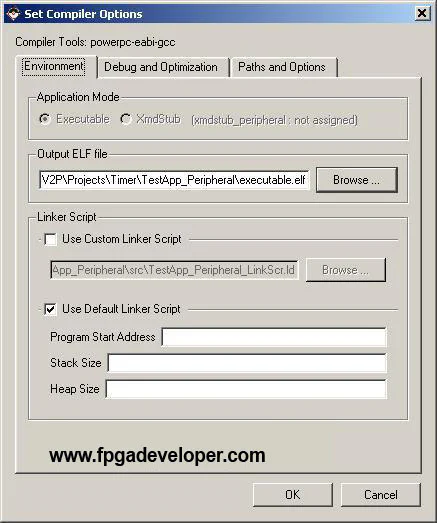 As mentioned earlier, the PowerPC requires an interrupt vector table to know what code to run when an interrupt occurs. The vector table resides in memory reserved by the linker script. The custom linker script for the TestApp_Peripheral application does not include a vector table, so we need to switch to the default linker script.