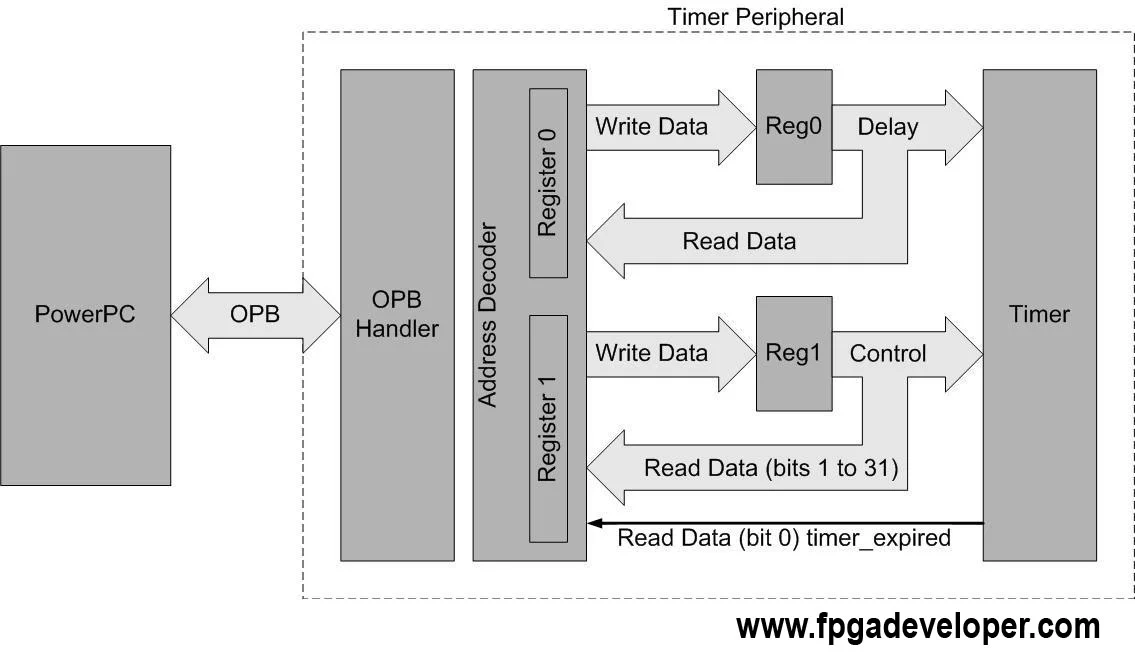 pcores\my_timer_v1_00_a\hdl\vhdl. This folder contains two source files that describe our peripheral my_timer.vhd and user_logic.vhd. The first file is the main part of the peripheral and it implements the interface to the OPB. The second file is where we place our custom logic to make the peripheral do what we need it to do. This part is instantiated by the first file.user_logic.vhd. We will need to modify this source code to include our timer code.--USER signal declarations added here and add the following lines of code just below.-- Timer signals and components
