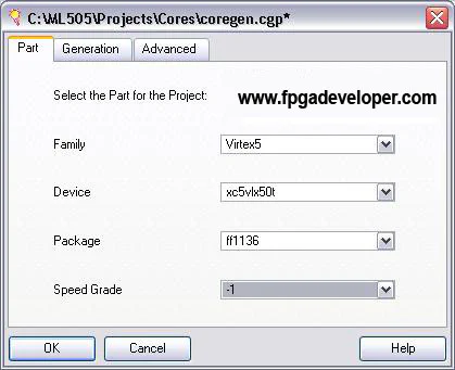 You will be asked for the specifications of the FPGA you are using. All the cores you generate under this CORE Generator project file will be customized for the FPGA you specify here. Under the “Part” tab, select these options: Family “Virtex5”, Device “xc5vlx50t”, Package “ff1136”, Speed grade “-1”. Click “OK”. Note: If you are not using the ML505 board, these specifications may not apply to you. You will have to enter the details corresponding to the specific FPGA that you are using.