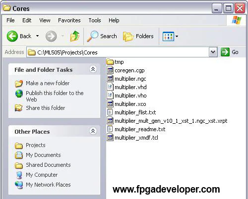 We will now examine the generated files and explain their purpose and utility. Different IP cores will be generated with a different set of files. It is always in your interest to examine the generated files when you generate an IP core, because you will often find useful documentation and examples. The types of files generated for the Multiplier core are common to other IP cores, however you can usually expect more files to be generated for more complex IP cores.