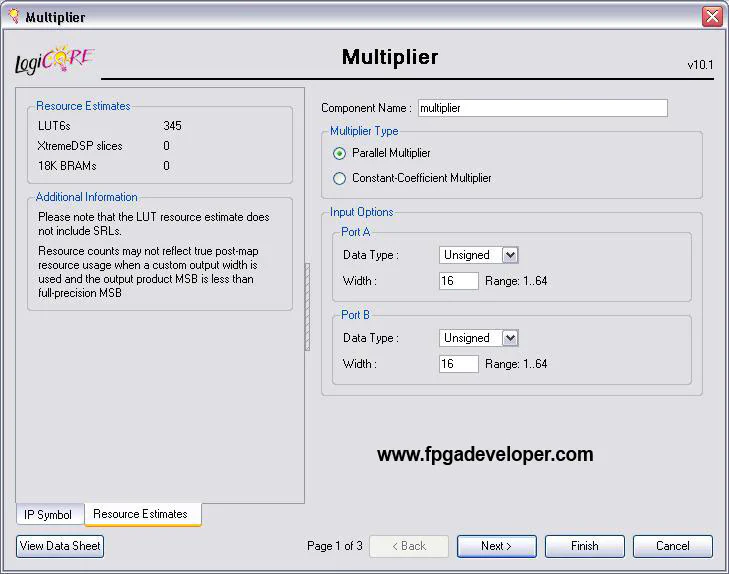 A dialog box should open to allow you to select the features of the Multiplier you want. For “Multiplier Type” select “Parallel Multiplier”. Select “Unsigned” for both port inputs and give them a width of 16 bits.