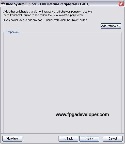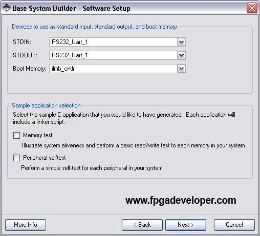 RS232_Uart_1 for both STDIN and STDOUT. The Base System Builder can produce sample software applications to run on the Microblaze and test the memory and peripherals. For this project we will not need them as we will create our own. Un-tick “Memory Test” and “Peripheral Test”. Click “Next”.