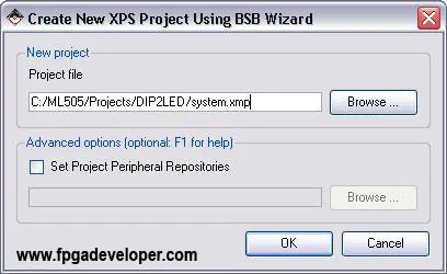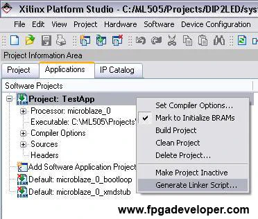 In this example, we will develop a simple FPGA project using the Base System Builder that includes three peripherals: the RS232 UART and two GPIOs. One GPIO will be used for the DIP switches and the other for the LEDs. We will then use a C program to read data from the switches and write it to the LEDs. The result is that the LEDs will display the DIP switch settings.