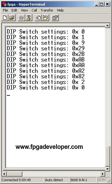 The simple C program that we added to this project simply reads the DIP switch settings and sends a message with that data to the UART. It also writes the same values to the LEDs. When the application is running and Hyperterminal is open, the DIP switch settings should be seen on the LEDs and on the Hyperterminal screen. Change the DIP switches to see the message change.