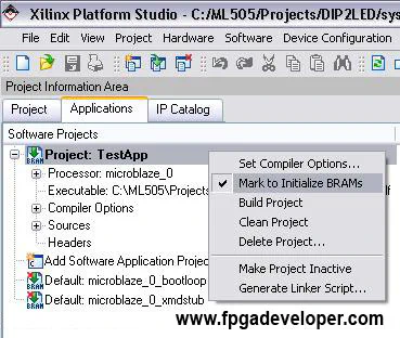 Default: microblaze_0_bootloop and select “Mark to Initialize BRAMs”. The icon will now have a small red cross signifying that it will not run on the Microblaze.
