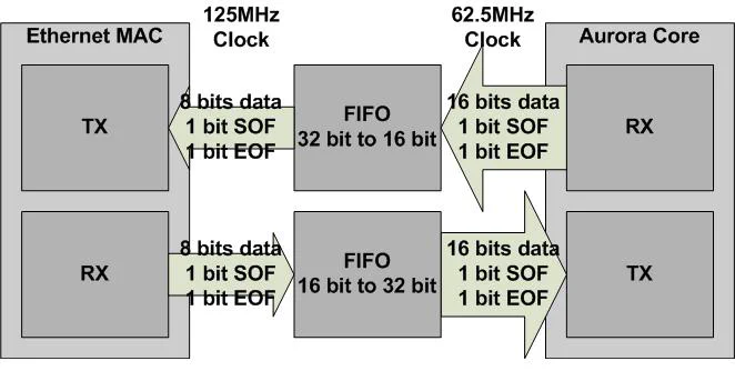 To solve our problem, we will use two FIFOs with independent read and write clocks and non-symmetric aspect ratios. We will have to generate one FIFO for each direction of data flow. The first FIFO will need an input width of 16 bits and an output width of 32 bits (for the EMAC RX to Aurora TX connection). The second FIFO will need an input width of 32 bits and an output width of 16 bits (for the Aurora RX to EMAC TX connection). We have chosen to use double the data width in all cases because we are dealing with frame data and so we also need to transfer the Start of Frame (SOF) and End of Frame (EOF) bits.