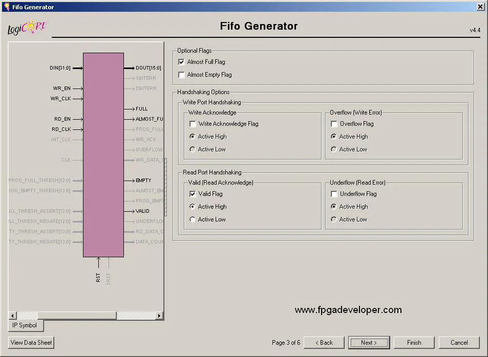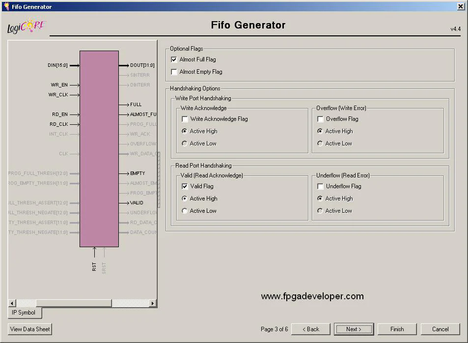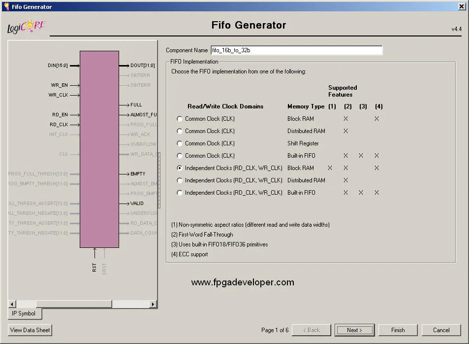 A dialog box should open to allow you to select the features of the FIFO you want. Re-name the FIFO as fifo_16b_to_32b and then enter the settings shown in the images below.
