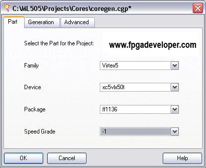 You will be asked for the specifications of the FPGA you are using. All the cores you generate under this CORE Generator project file will be customized for the FPGA you specify here. Under the “Part” tab, select these options: Family “Virtex5”, Device “xc5vlx50t”, Package “ff1136”, Speed grade “-1”. Click “OK”. Note: If you are not using the ML505 board, these specifications may not apply to you. You will have to enter the details corresponding to the specific FPGA that you are using.