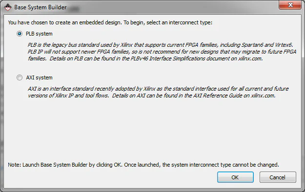 The first page of the wizard will ask us to choose between using a Processor Local Bus (PLB) or an Advanced Extensible Interface (AXI). As we are using the Virtex-5, we have to select a PLB system, but if you are working with a Virtex-6 or a Spartan-6 you are better to go with the AXI system.