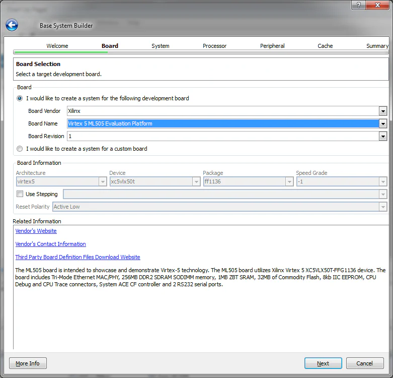 On the “Select Board” page, select “Xilinx” as the board vendor. Then select the board you are using (eg. “Virtex 5 ML505 Evaluation Platform”). Select “1” as the board revision. Click “Next”. (Note: If you are using the XUPV5 (ML509) board, select “Virtex 5 ML505 Evaluation Platform” instead.)