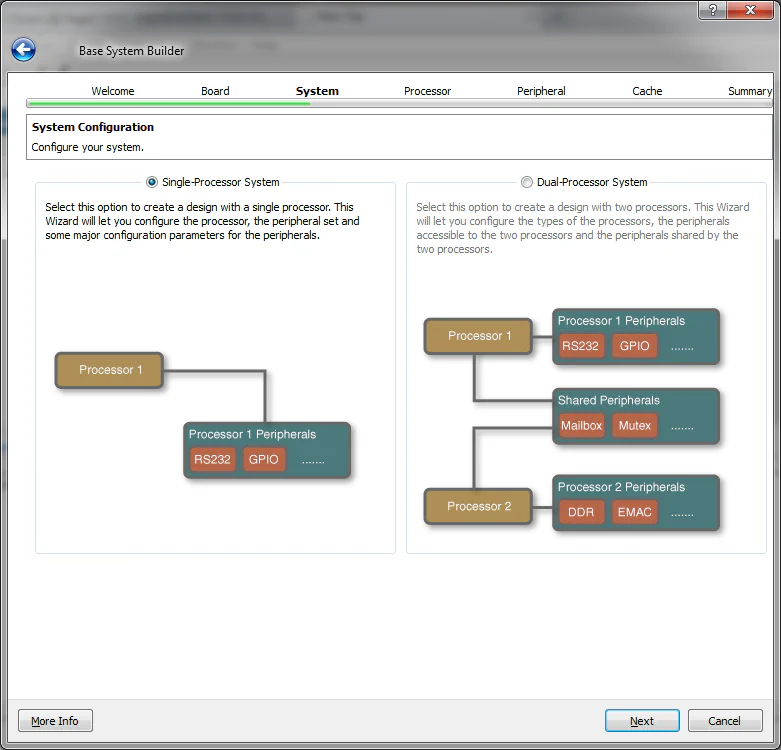 Now we have the choice to build a single-processor or dual-processor system. The Virtex-5 doesn’t have any hard processors, so the Base System Builder will setup a Microblaze soft processor for us. Select “Single-Processor System” and click “Next”.