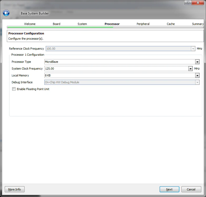 On the “Configure Microblaze” page, we can specify the clock frequency of our processor and the amount of memory it will use. Select the clock frequency to 125MHz. Click “Next”.