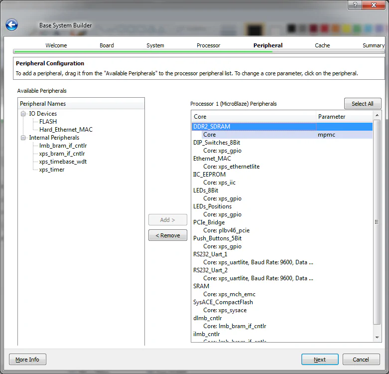 Now we can select the peripherals to put in the design. The peripherals will all be connected to the Microblaze processor via the PLB and they allow us to control and access features of the FPGA and external hardware such as the DDR2 memory and the Ethernet MAC. We will leave the default setting which is to include ALL the standard peripherals. You might ask “Why include all the peripherals?”, well most of the time you would only include the peripherals that you need so that you don’t waste time building peripherals you wont use. In this case, I want you to include all the peripherals because a lot of the following EDK tutorials will be based on this “base system”. This way, we wont have to go through the Base System Builder for every tutorial and we’ll save time. The fact is, in a professional environment, you would never go through the Base System Builder when starting a new project, instead you would take an existing project and develop from that.