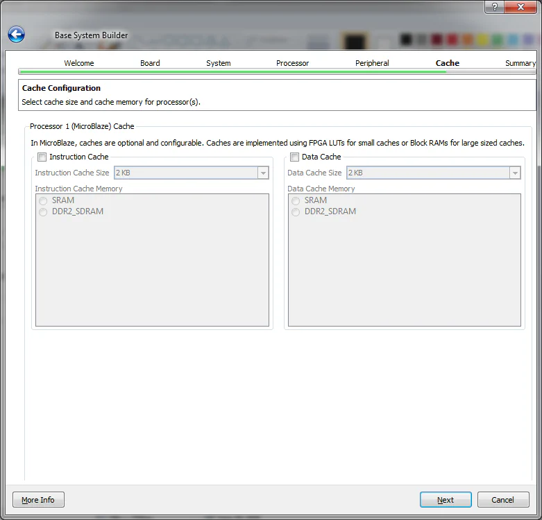 In the next page we can configure cache memory for the Microblaze. In our case we wont use cache memory so leave the default and click “Next”.