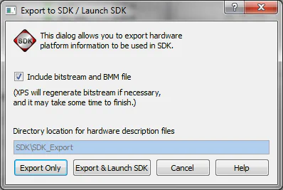 - From the EDK menu, select “Project->Export hardware design to SDK”.