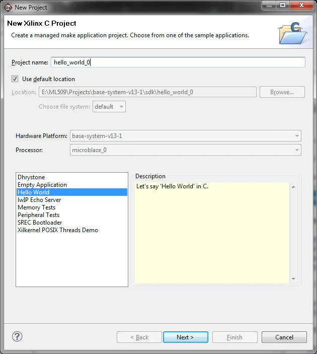 - The wizard that follows will allow us to create a template software application for our project. The default is the “hello world” example and we want to start with this one. Click Next to accept the defaults as shown in the image below.