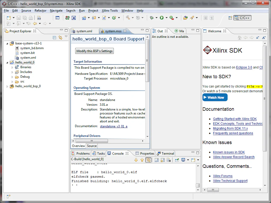 Creating a project using Base System Builder, we used the Embedded Development Kit (EDK) to create a hardware design composed of IP cores and a Microblaze soft processor. In this tutorial, we will complete the design by writing a software application to run on the Microblaze processor. In version 13.1, this is done using the Software Development Kit (SDK) and it is no longer “doable” in the EDK. To keep things simple, we’ll start off with a “hello world” application and then move onto one that will communicate with our peripherals. Specifically, we will read the DIP switch settings and display them on the terminal screen using printfs.