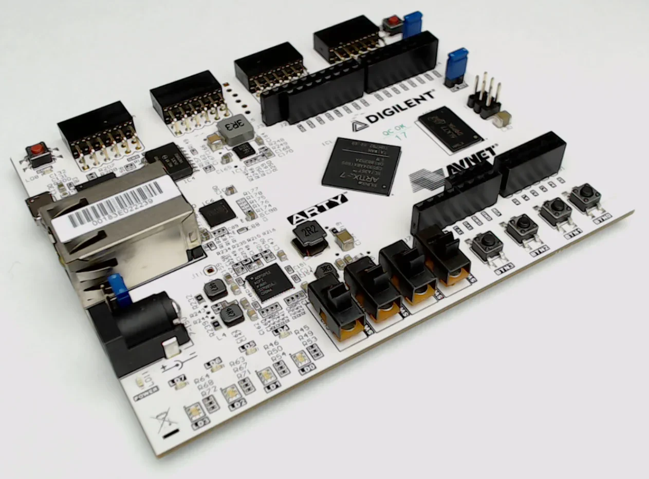 Here’s a base project for the Arty board based on the Artix-7 FPGA. The Arty is a nice little dev board because it’s low cost ($99 USD) but it’s still got enough power and connectivity to make it very useful. I really like the fact that the JTAG and UART are both accessed through the same USB connector, so I only need to connect one USB cable. I also like the fact that I can power it from the USB connector alone - provided I don’t connect too many power hungry PMods or an Arduino shield.